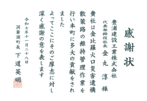 洞爺湖町での草刈り奉仕活動に感謝状をいただきました